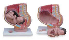 Features: This median section model demonstrates female pelvis during the 40th week of pregnancy with a removable fetus, normal position of child before birth, female genital organs, human reproductive and urinary systems. A uterus with embryo in 3rd month of pregnancy is mounted on base for observation. |